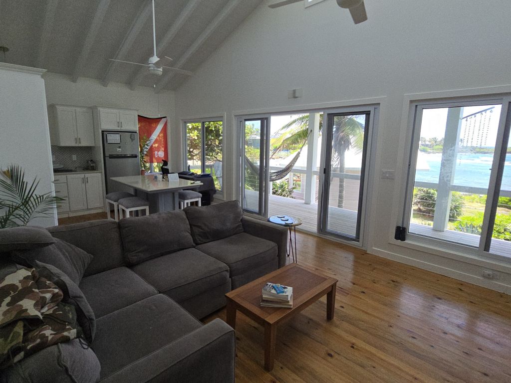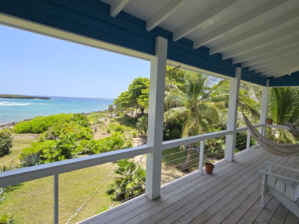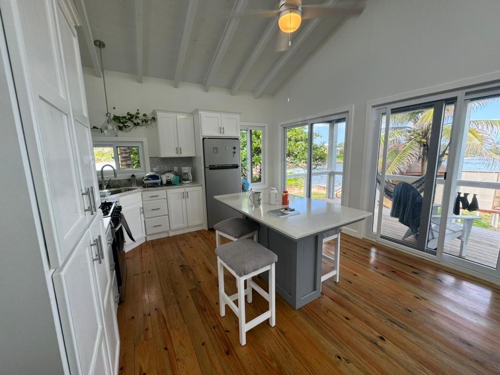 The main residence features 2 bedrooms and 2 bathrooms, including a spacious master suite with en suite bath, walk-in closet, and captivating sea views. A separate 1 bed/1 bath apartment on the ground floor offers added flexibility - ideal for guests, rental income, or multi-generational living. Both units boast modern kitchens with stainless steel appliances, sleek white cabinetry, and open-plan living/dining areas that open onto porches overlooking the cove - perfect for sunset lounging or hammock naps.